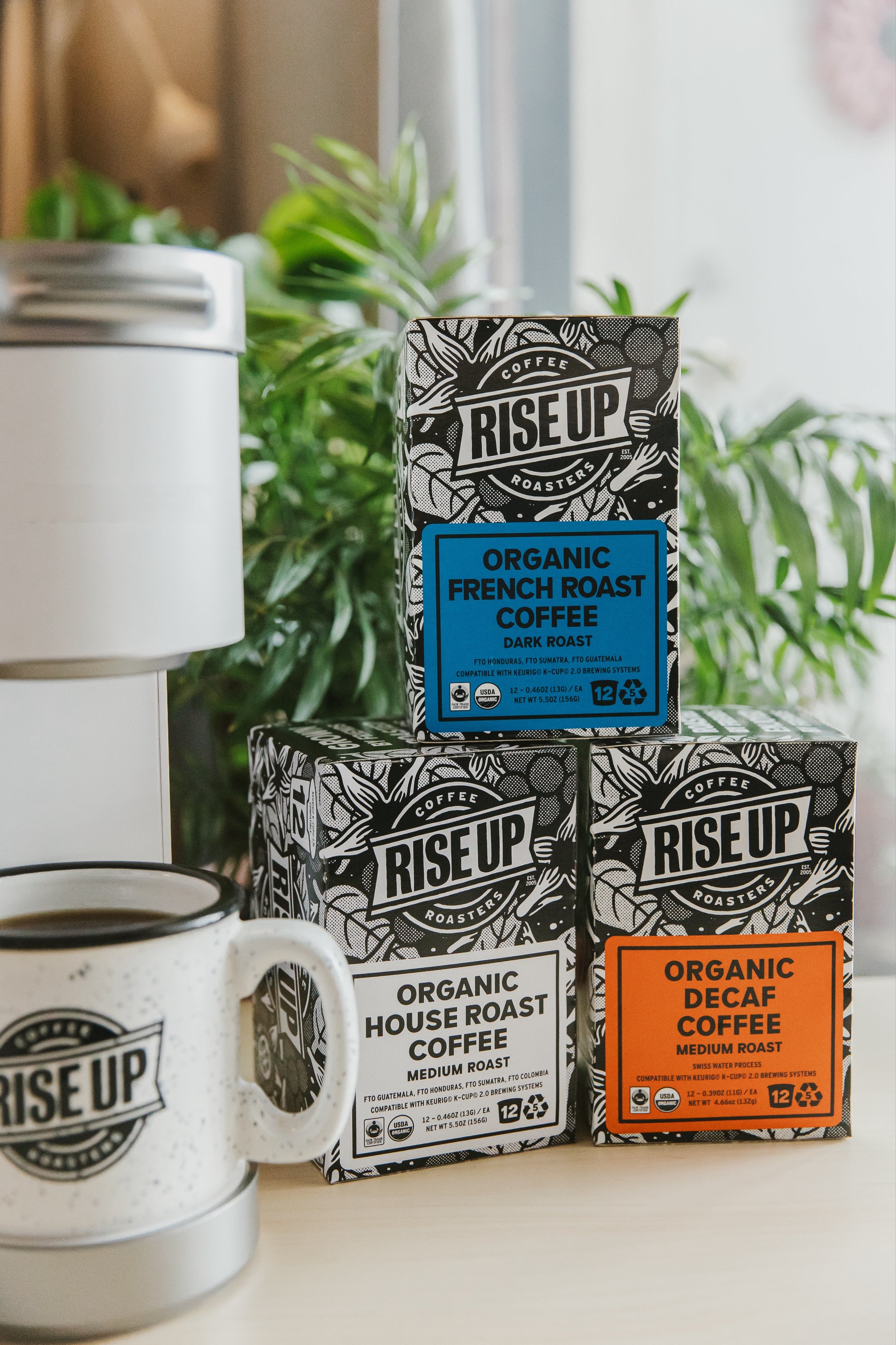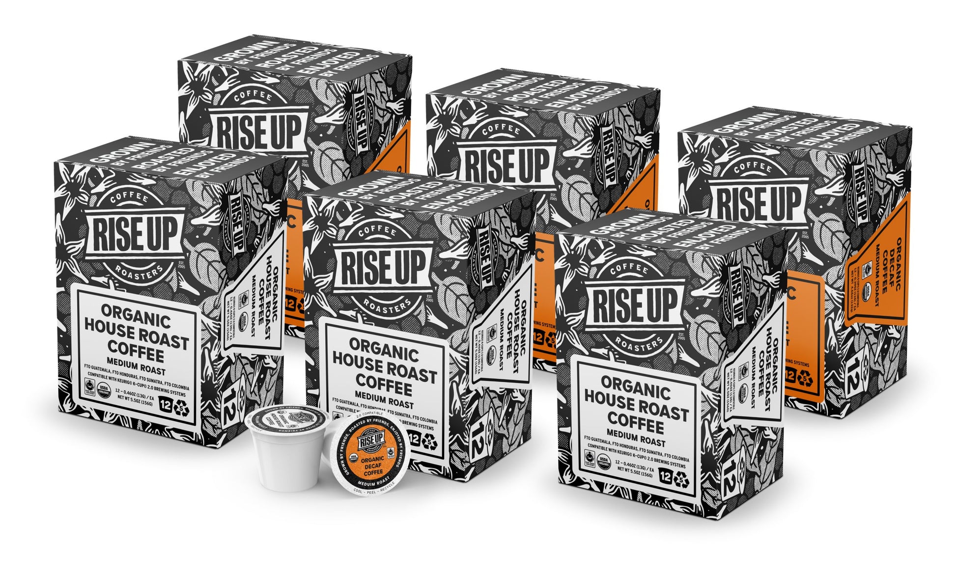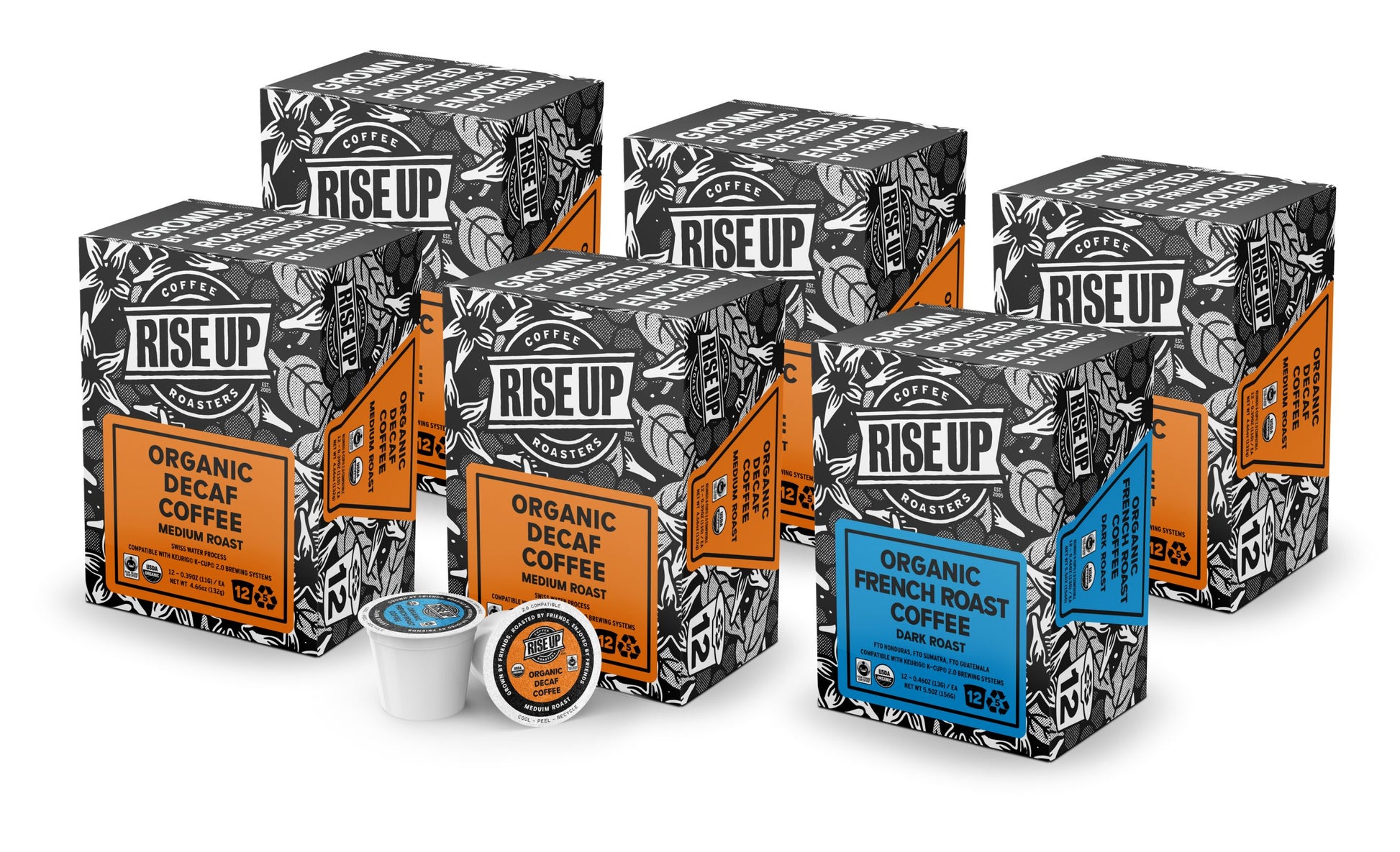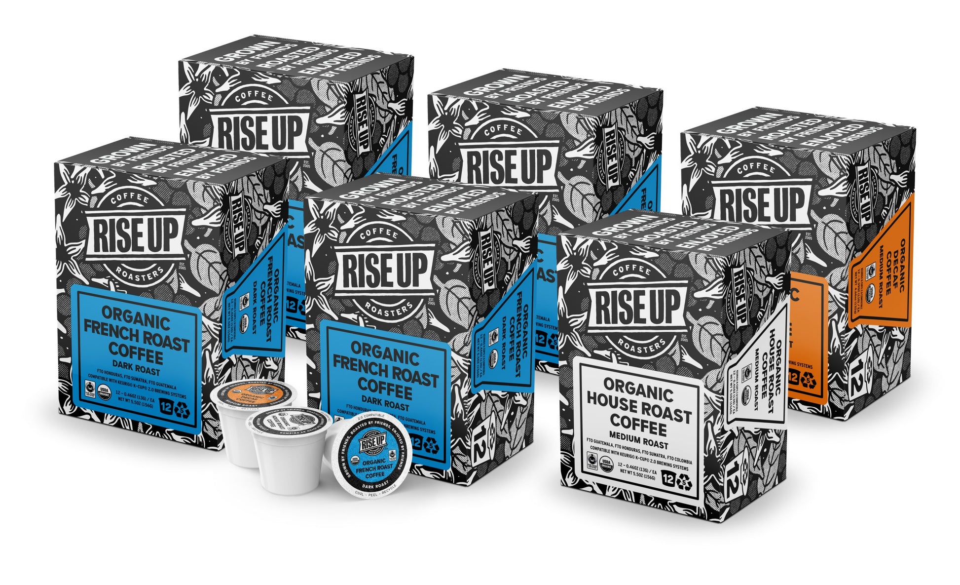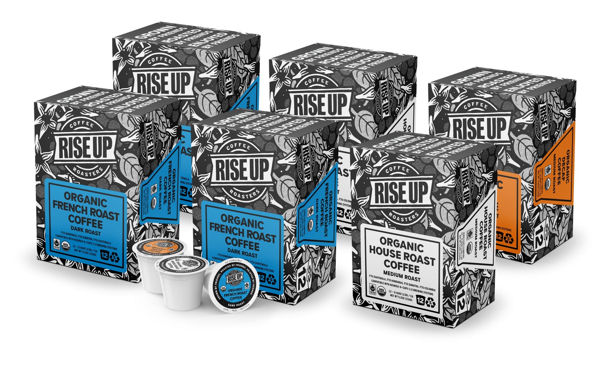COFFEE: Our flagship coffees, only in K-Cup form. Offered in bulk varieties of six cases (72 pods). Please let us know if you’d like to purchase a variety pack not currently offered here (info@riseupcoffee.com).