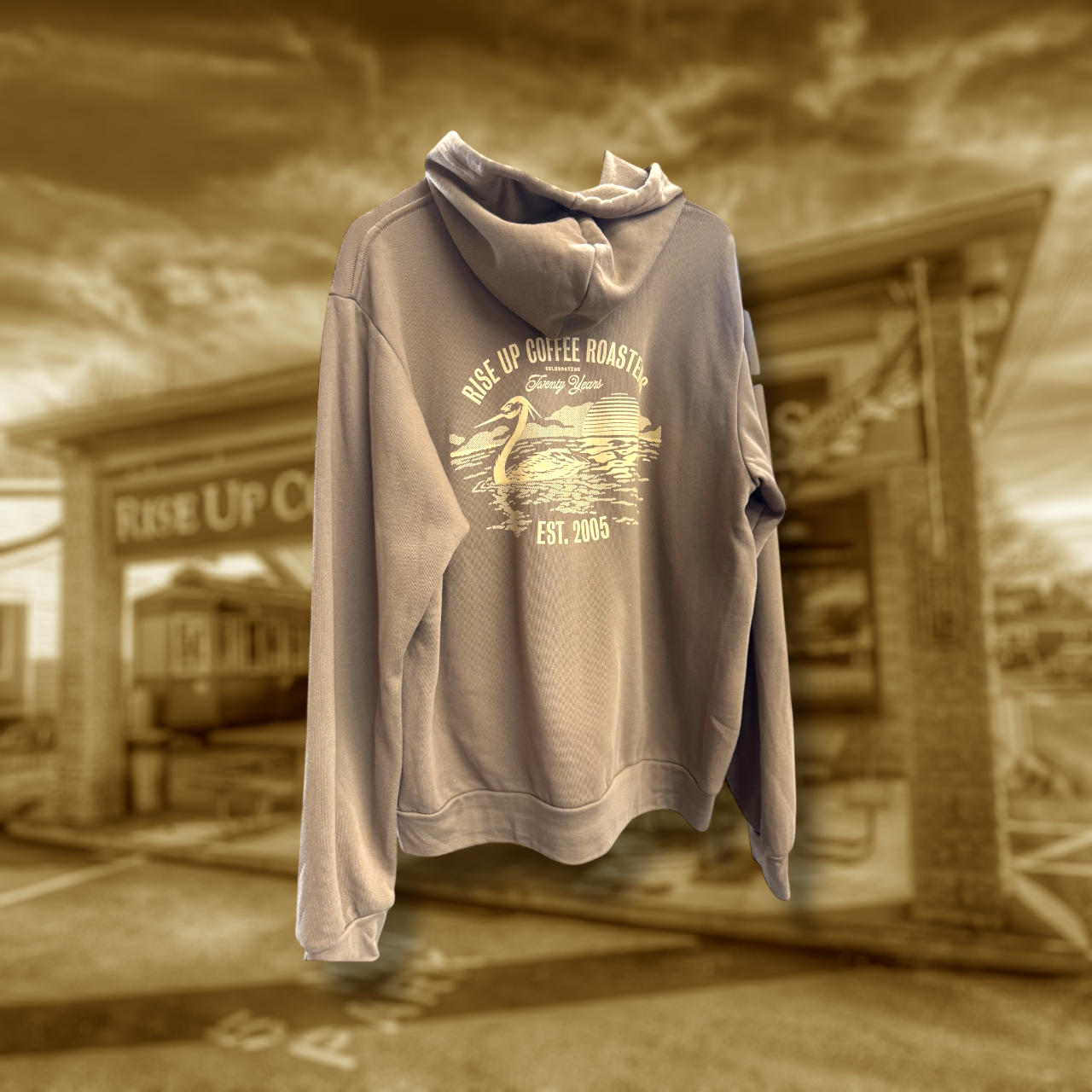 This Bella + Canvas sponge fleece in Vintage Brown features bone-white left-chest and full-back prints created exclusively by JP Flexner to honor 20 years of Rise Up Coffee.