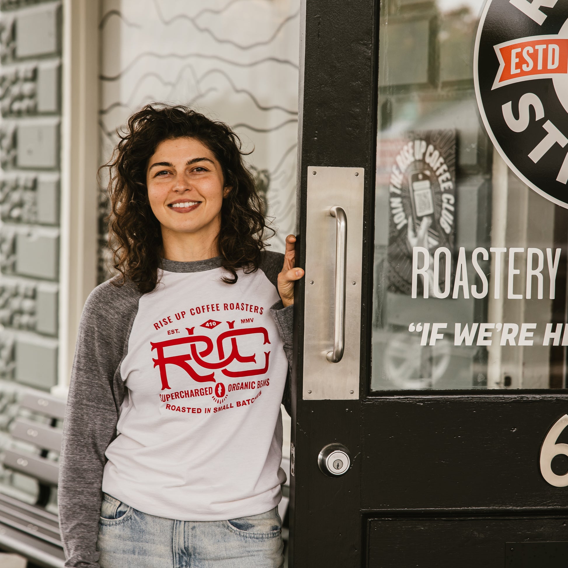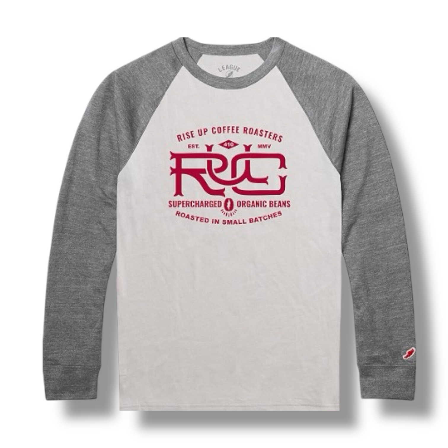 A vintage-inspired raglan with heather gray body, fall-toned sleeves, and our throwback Supercharged logo. Easy comfort, classic style, all Rise Up.
