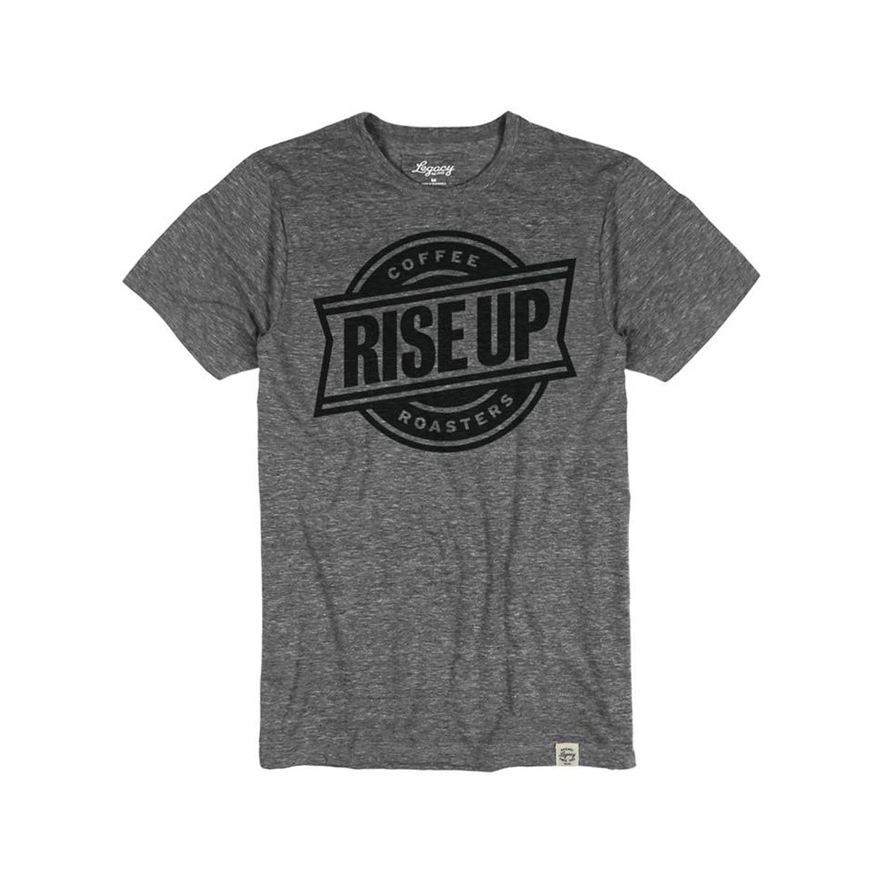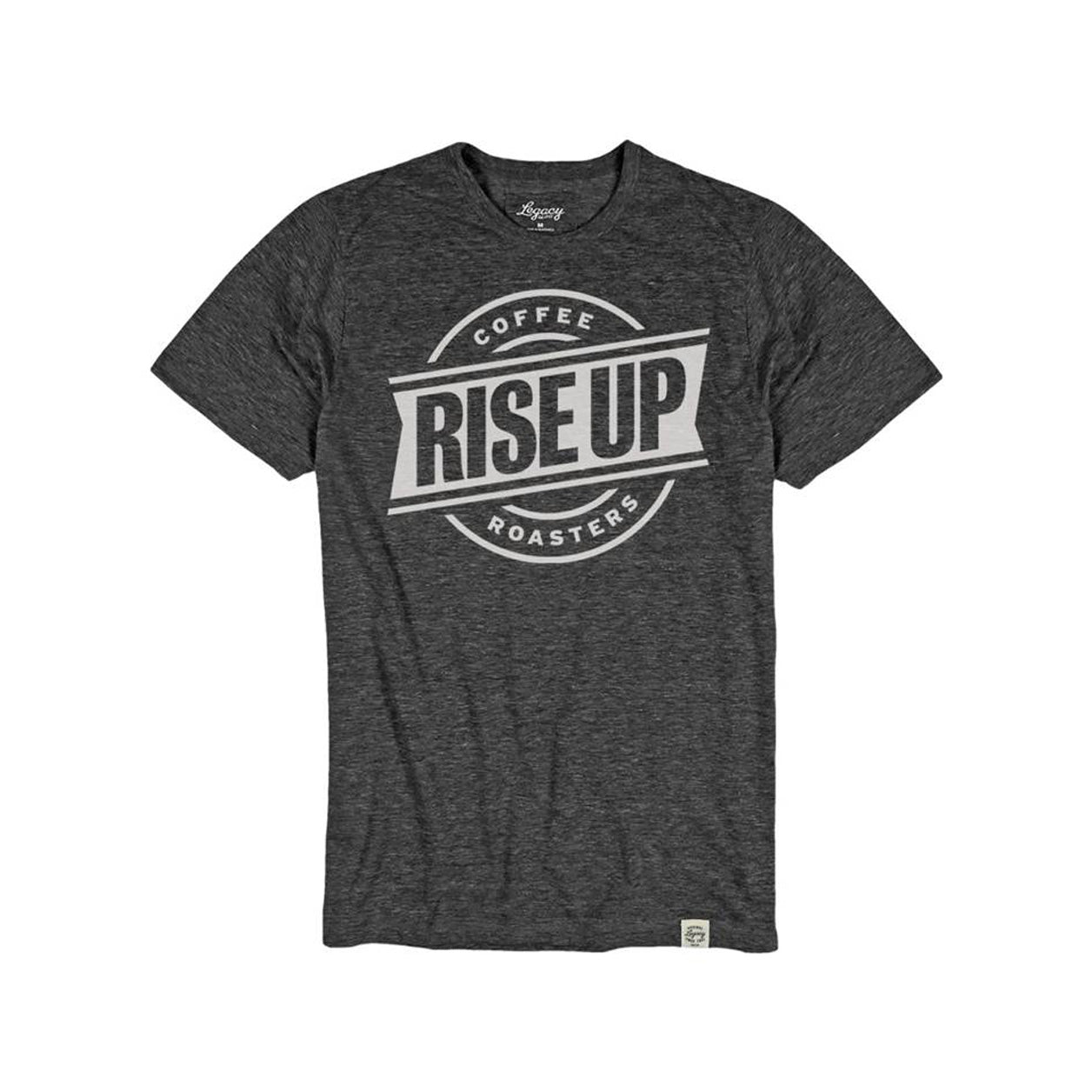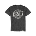 Rise Up logo printed black on heather gray or white on dark gray.